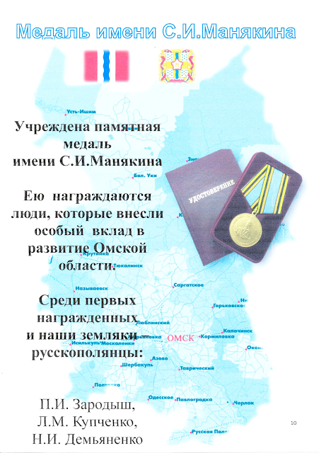 7 сентября 2016 года в санатории «Рассвет» Нателы Полежаевой прошла торжественная церемония вручения медали имени Манякина Герою социалистического труда 84-летнему Петру Ивановичу Зародышу. Более сорока лет он проработал механизатором в Русско-Полянском районе. Награду за вклад в развитие Омской области лично вручил Степан Бонковский – депутат Заксобрания Омской области.